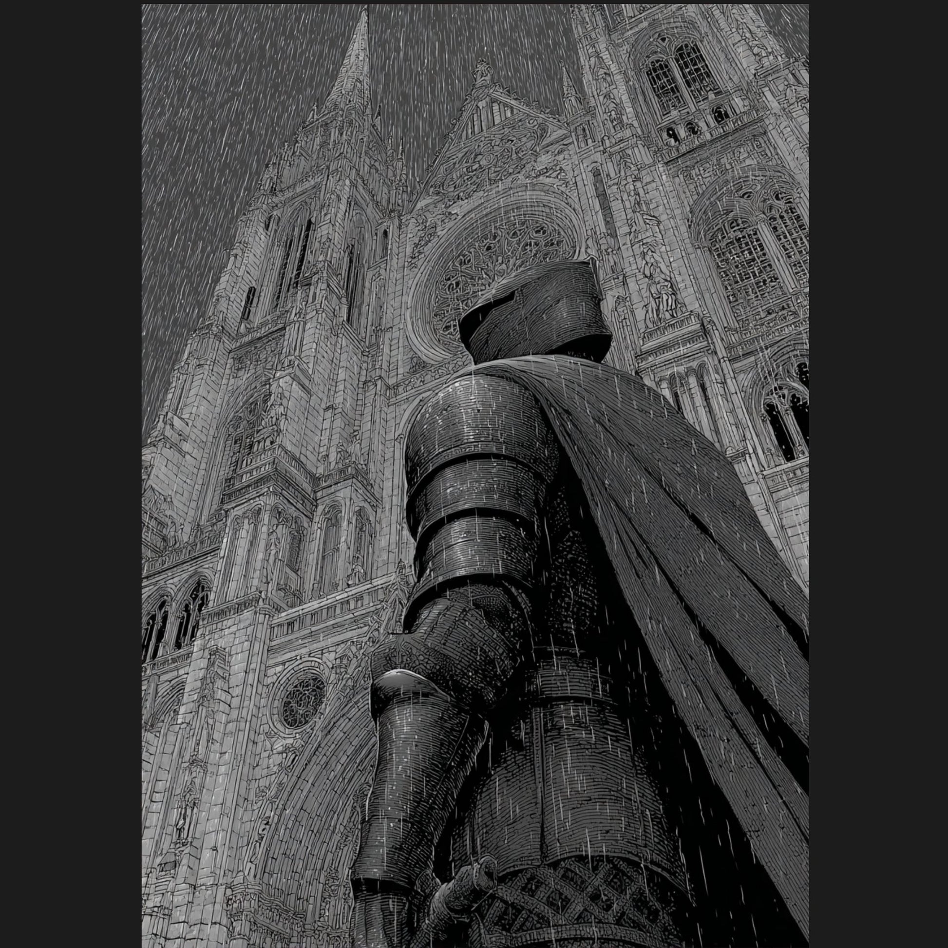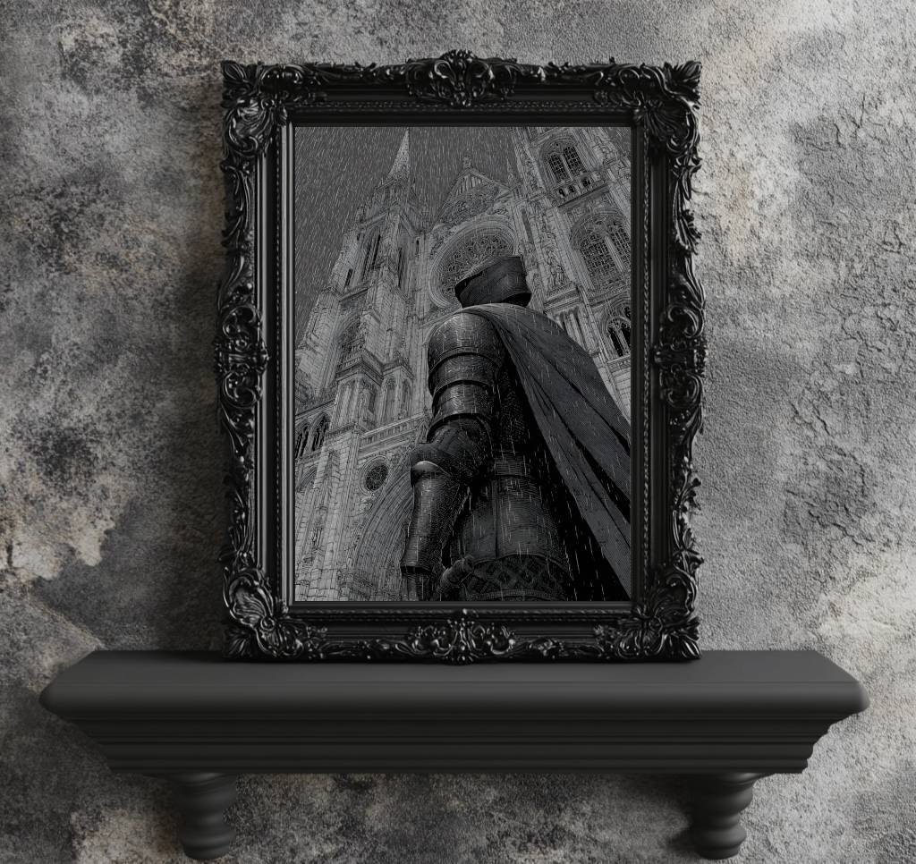 „Die letzte Bastion“ hält den Atemzug vor dem Aufprall fest: Ein einsamer Ritter trotzt dem Regen und steht Wache vor der Kathedrale. Kalter Stein, schwerer Stahl, tiefes Rot – ein Blick, und der Raum wird zur Festung.