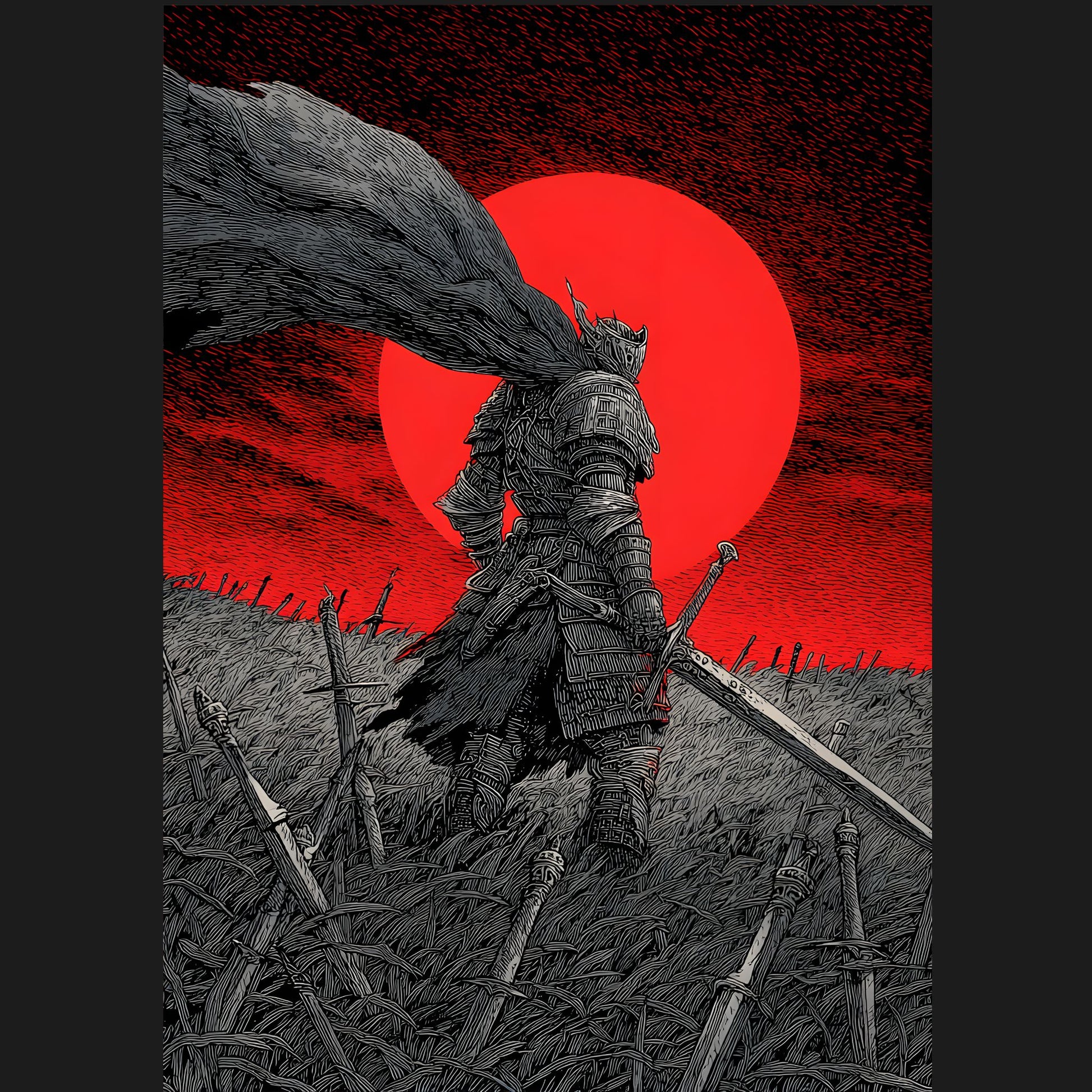 „Unter dem Blutmond“ hält den Moment, in dem alles langsamer wird und die Jagd beginnt. Lange Silhouetten, scharfe Kanten, stilles Rot – ein Blick, und der Raum wird zum Omen.